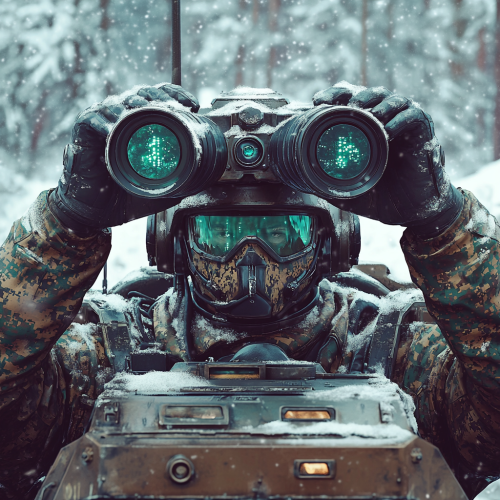 realistic close up front view of a camouflaged cyborg tank commander looking through futuristic binoculars whilst peering through the top of a futuristic armoured tank, background is a snowy forest