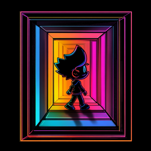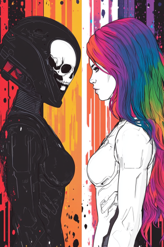 Cyberpunk themed parallel between two characters featuring one corporative mercenary woman wearing a black combat suit with a black helmet featuring a digital and holographic white skull covering the face, and one woman with rainbow long hair wearing a white top with rainbow designs. The illustration represents parallel and contrast between these two characters looking at opposite sides. Background consists on a disruptive black red digitalization on one side and rainbow colored splattered colors on the other side. The scenery is composed to be two sides, the corpo and the rebel, creating a lively and remarkable clean illustration, pastel colors.