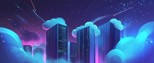 Generate a digital art for A digital art representation of cloud computing skills in demand, featuring a futuristic cityscape with towering servers and data streams flowing through the sky. The scene is dominated by shades of deep blue to represent the color, with accents of white and light blue to highlight the cloud elements. The background should be vibrant and dynamic, capturing the essence of modern technology and cloud infrastructure. --ar 12:5