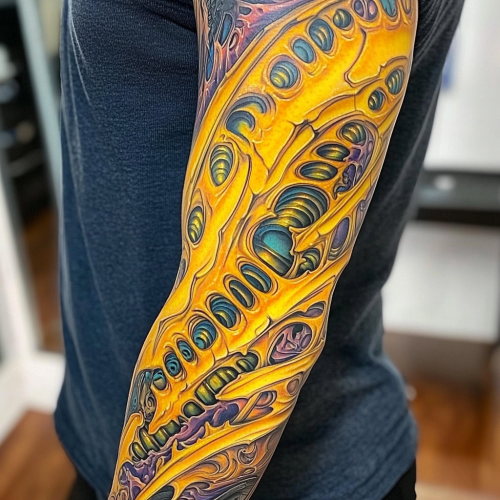 a colorful biomechanical tattoo sleeve, that has yellow intricate blade-like structures that flow around the arm. The background of the design should be an organic alien substance. Make it in the style of Guy Aitchison.