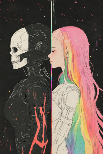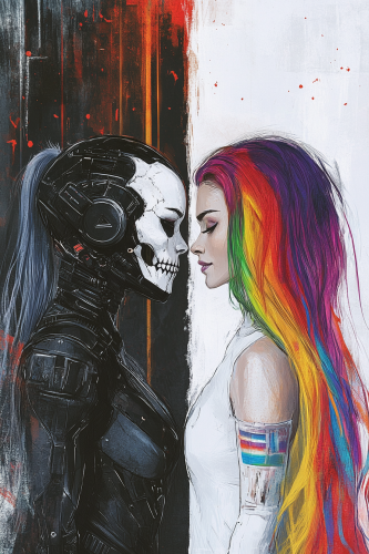 Cyberpunk themed parallel between two characters featuring one corporative mercenary woman wearing a black combat suit with a black helmet featuring a digital and holographic white skull covering the face, and one woman with rainbow long hair wearing a white top with rainbow designs. The illustration represents parallel and contrast between these two characters looking at opposite sides. Background consists on a disruptive black red digitalization on one side and rainbow colored splattered colors on the other side. The scenery is composed to be two sides, the corpo and the rebel, creating a lively and remarkable clean illustration, pastel colors. --v 6.1 --ar 2:3