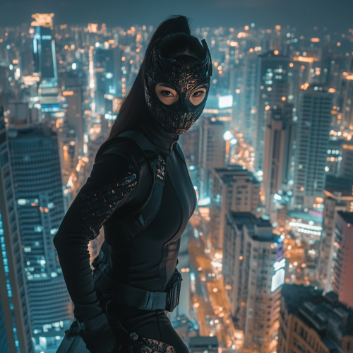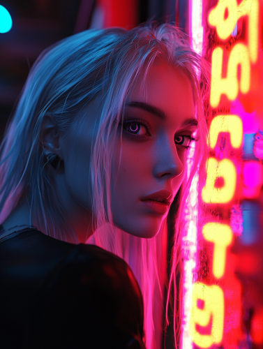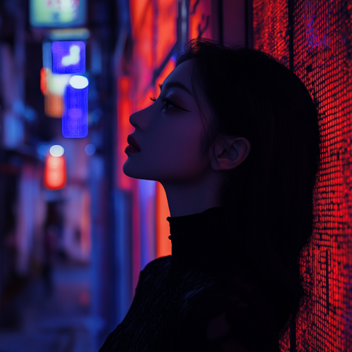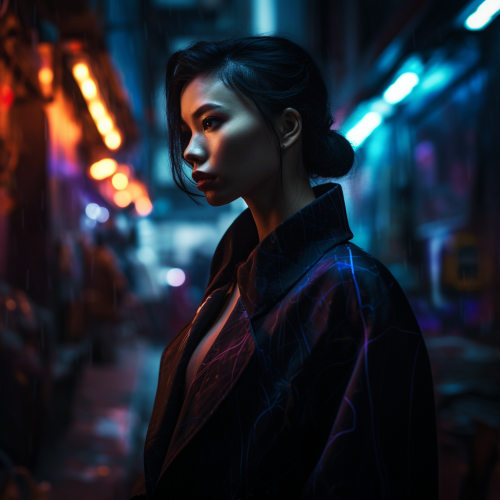 Photo of humanoid woman caught in a dramatic Neo-Noir Chiaroscuro scene, with stark contrasts between deep shadows and piercing highlights. Incorporate elements of hong-kong of the future, accent of dark blue with orange-purple notes for maximum impact --v 6.1