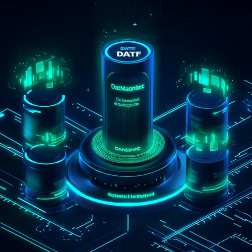 "Top-down perspective of a futuristic, high-tech platform with exactly four sleek, metallic pillars symmetrically arranged in a circular formation around a central, taller pillar. Each outer pillar has glowing neon accents in blue and green and is labeled with holographic text: 'Data Management,' 'Interactive Advertising,' 'Integrated Gaming,' and 'Social Impact.' In the center, a single, taller pillar displays a large, glowing token labeled 'DATF,' illuminated with a radiant aura. The background is a dark digital grid with subtle circuit patterns and connected nodes, creating an advanced technology atmosphere. Use cool blue, green, and dark tones to give a clean, sci-fi aesthetic.