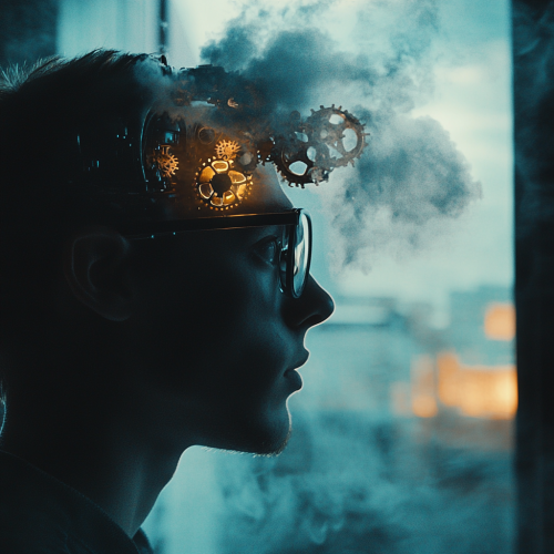 a side shot showing a guy wearing glasses looking at a screen. inside the guy's head are several small gears turning. above his head are clouds of steam forming a storm. it's a dark, poorly lit night. movie quality. realism.