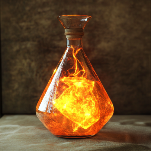 an alchemical flask filled with a substance like mercury element but the mercury is orange and slightly glowing as if filled with magical energy. the flask is locked under pressure