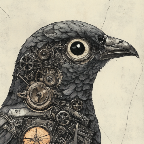 Create an illustration inspired by Edward Gorey’s style featuring a mechanical bird with a Victorian-era aesthetic. The bird should have intricate metallic parts, gears, and rivets, with a touch of patina to emphasize an aged, steampunk feel. Use meticulous cross-hatching to enhance shadows and textures, capturing the metal's reflections and worn look. Keep the bird’s design simple yet evocative, with exaggerated, almost eerie features, like a large, expressionless eye and a slightly disproportionate, mechanical body. The background should be minimal, perhaps just a hint of dark shading, to bring focus to the bird and evoke a sense of isolation. Include symbolic motifs like subtle cracks or vintage clock elements to deepen the Gothic, timeless atmosphere.