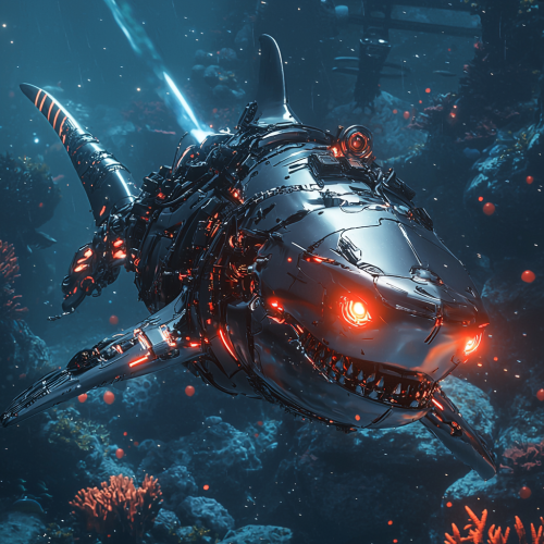 Underwater scene with a massive robot shark, partially mechanical with metal plates and armor, glowing red eyes emitting laser beams. The shark's body is a combination of sleek metal and organic features, with visible robotic parts on its fins and body. The background shows a dark ocean with glowing coral reefs and bubbles, adding a mysterious, intense atmosphere. The robot shark looks menacing and powerful, ready to attack, with light beams and reflections bouncing off its metallic surfaces, concept art, cartoon children illustration, Disney Pixar style --q 2