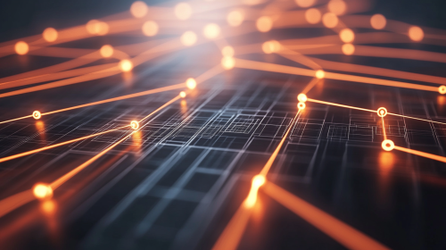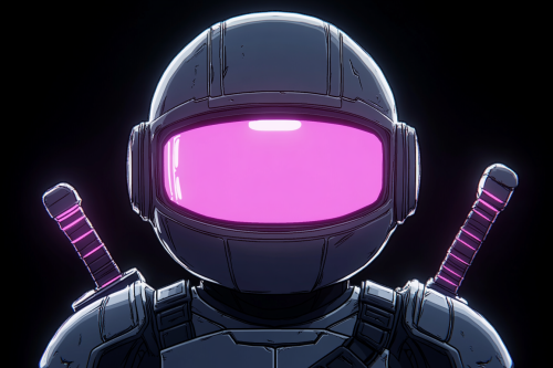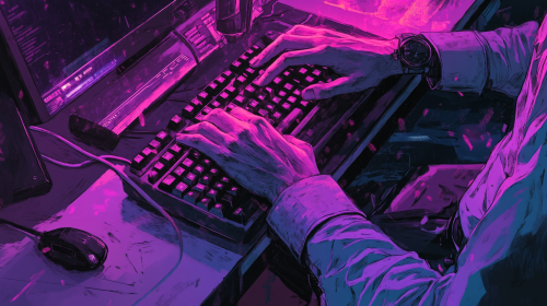 a cyber punk office, a macro closeup looking down on hands typing on a keyboard, the neon glow can be seen on the hands and keyboard, lots of purple and pink neon accents. Make the hand more of a subtle illustrated vector look and not a human hand. The shirt sleeves should be professional and similiar to a button up shirt or blazer --ar 16:9 --v 6.1