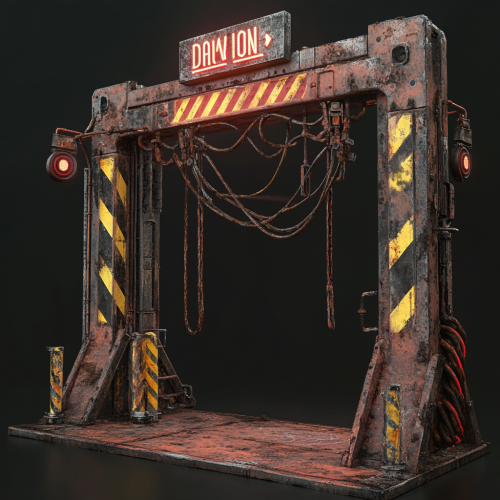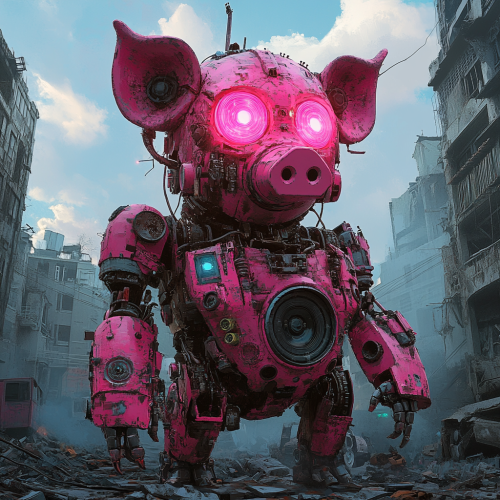 The image depicts a towering robotic figure in a post-apocalyptic cityscape, inspired by a pig with oversized features and bright, expressive eyes. The robot has the head of a pig, complete with a playful yet menacing grin. Its body has a robust, playful design, featuring bright pink metallic and industrial elements. Its torso and limbs are encased in shiny pink, armor-like plating, giving it a whimsical yet ominous appearance. Prominent on its chest and head are multiple large, glowing pink circular lights that resemble eyes, emitting a cheerful yet eerie hue, giving the machine a unique presence. Extending from its back are mechanical structures with large speakers and pink light elements, arranged in a fan-like shape, possibly functioning as playful communication devices. Its arms are fitted with complex, articulated machinery, resembling cartoonish robotic hands that can either interact playfully or pose a threat. The background features a city in decay, with partially ruined and abandoned buildings under a pastel-colored sky, suggesting a whimsical yet dystopian world.