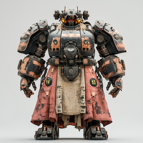 sci-fi mech idea, 3d rendered, high quality, future robot, military look and oriental classic costume mix, robot wearing clothes made of cloth and wood, martial arts and sci-fi mix mecha, --q 2 --s 250