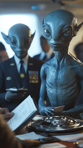 A brightly lit, sterile government briefing room with scientists, military officials, and two tall, otherworldly extraterrestrial beings standing beside them, the aliens’ blue-gray skin glistening under the harsh lights, large reflective eyes scanning the room with unsettling calm, scientists holding thick files, some with tense expressions, advanced alien artifacts on the table between them, colors sharp with cold whites and steely greys, high contrast, hyper-realistic with detailed alien features and expressions of unease among the humans.