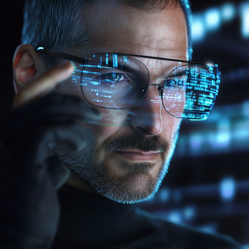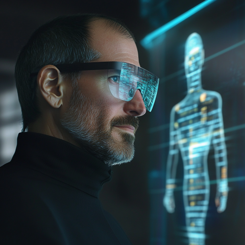 Steve Jobs wearing Augmented Reality glasses (black glasses that look like normal reading glasses) and looking at a hologram display feet from him in style of 3D anime, Matrix inspired