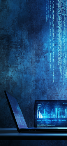 Generate a digital art for A sleek laptop with a holographic display of coding symbols and data charts floating above it, on the right side of the screen. The background is textured with a deep blue resembling rough concrete or marble, creating contrast between deep blue and lighter shades of blue. A subtle shadow falls across part of the textured surface below the floating holographic display, adding depth to the scene. The atmosphere conveys elements from the tech industry and digital innovation. . --ar 443:960