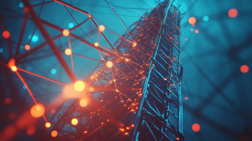 glowing, interconnected network lines and dots, symbolizing digital connectivity. The overall ambiance is futuristic and high-tech, with soft, neon-blue lighting and a sense of data transmission in a connected network. The structure of the tower is intricate, with visible metallic framework, and the image has a sleek, digital feel, emphasizing the concept of wireless communication --ar 16:9 --v 6.1