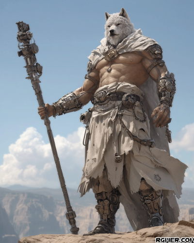 An exalted cybernetic Wolf God weilding a legendary arcane staff, The goddess is standing atop a mountain temple overlooking vast mountainous regions to the sea, The God's face is human but wolf qualities, instead of human ears the God has wolf ears, his body is muscular and hairy, his hands are many with wolf claws instead of nails, the God's legs are human but toes also have wolf claws like his hands, the God sports a wolf tail behind him, he is dressed in a godlike toga allowing him to move fluidly and quickly, he is a powerful God mage capable of devastation, machinery is integrated into his body elevating his power, detailed and gorgeously textured, elements of realism, creative, --ar 4:5 --q 2 --s 250 --p pvvmhk6 --v 6.1 --style raw