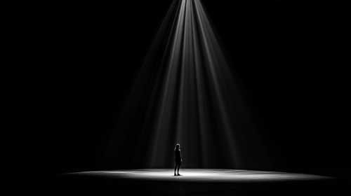 A completely dark black empty space. In the far there is a slim light beam going straight down the middle illuminating the silhouette of a person
