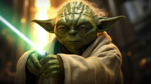 A highly detailed, close-up portrait of Yoda from Star Wars, captured in an intense moment of battle. His fierce expression and narrowed eyes are set in a powerful gaze, directed just past the camera as he holds his iconic green lightsaber firmly in his small but mighty hand. The lightsaber glows vividly, casting green light across his weathered face, enhancing the lines and textures of his skin and conveying the weight of his experience and strength. The background is a swirl of dynamic green and blue light trails, adding energy and motion to the portrait, while faint embers or sparks drift around, hinting at the fierce action surrounding him. His robes flow slightly from the movement, adding a sense of urgency and force to his stance. This portrait conveys Yoda’s power and determination as a Jedi Master, blending serene wisdom with battle-ready intensity – massurrealism, intricate details, clear features, global illumination, Nikon D850 DSLR, 200mm f/1.8 lens, f/2.2 aperture, 50k, 3D, UHD, rtx on --v 5.1 --s 1000 --ar 16:9