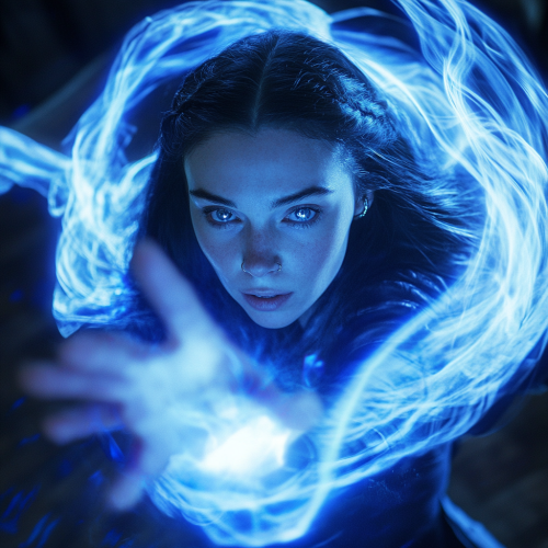 action scene, sorceress mid-teleport enveloped in magical blue light, motion blur, long black hair, pale skin, silvery blue eyes, tall, athletic, amused expression, silver nose ring