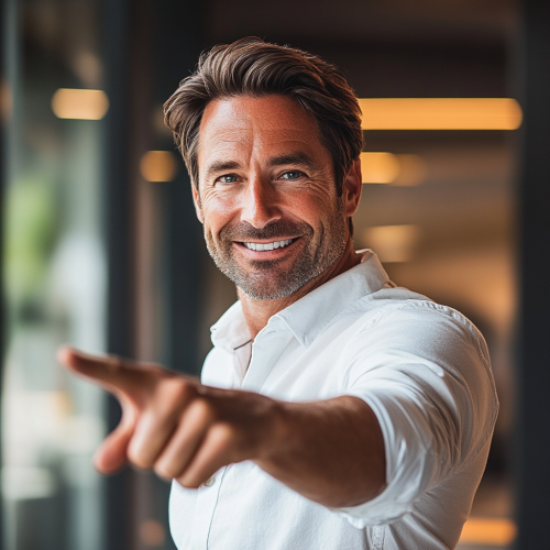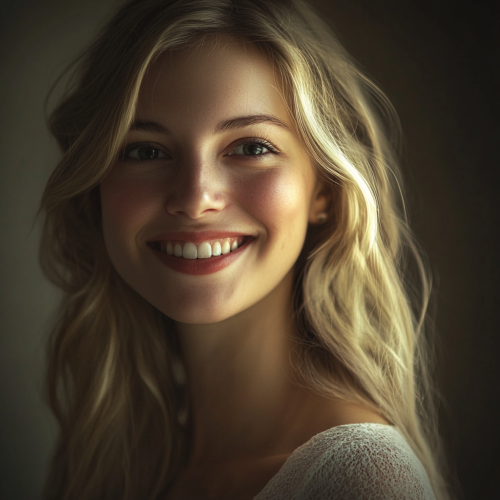 ‘Remove the terms working time and free time from your vocabulary. Replace them with life time and ask yourself: Does it make sense what I'm doing?’ create a very photorealistic image of an attractive smiling woman. The image should look like it was taken with a Fuji camera, with sharp details, natural shadows and a slight film-like grain. Camera specifications: Shot with a Fuji X100V with a 23mm f/2 lens, with a wide aperture to create a soft background blur while keeping the businesswoman in focus. Lighting should be soft, with a cool tone.