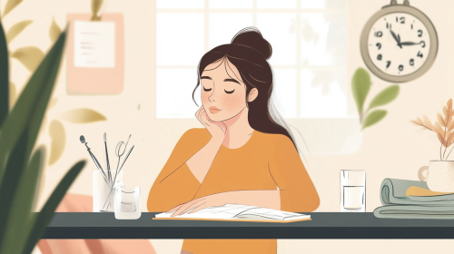 An image of a confident woman sitting at a desk, focusing intently on her planner or journal. Around her are symbols of healthy habits like a yoga mat, a glass of water, and a clock. The scene feels modern and minimalistic, with soft lighting, creating an atmosphere of focus and dedication. The background is subtly blurred, highlighting the woman as she works on establishing her new routines, with a sense of accomplishment and motivation. High resolution, 1920x1080 pixels, --ar 16:9