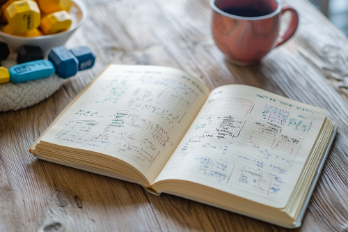 A fitness journal open to a page filled with workout plans and goals, 8K resolution --no text, numbers, signs, labels, signatures, watermarks, logos --q 2 --ar 3:2