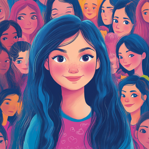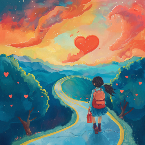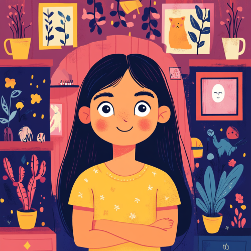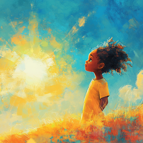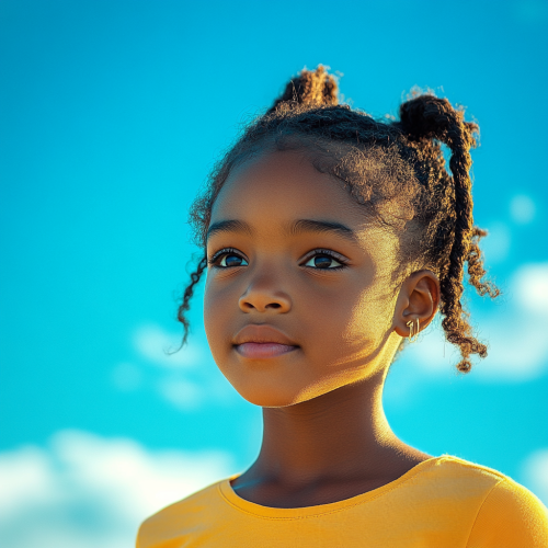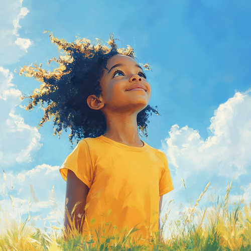 Close-up illustration of an 8-year-old Black child standing confidently on a hill, framed against a bright, open sky with a blend of uplifting colors--soft blues, vibrant yellows, and lively greens--creating an atmosphere of joy and inspiration. The child’s gaze meets the camera with warmth and pride, her eyes sparkling with self-assurance, and her stance radiates pure confidence and inner strength. Her posture is open and relaxed, embodying a deep sense of self-worth and pride in her identity. The surrounding colors and whimsical details--hints of swirling patterns in the sky and playful shapes--add to the dreamlike, uplifting feel. Illustrated in the bold, vibrant, and playful style of Mary Blair, using strong shapes, vivid colors, and a touch of surrealism, the overall scene feels joyful, timeless, and empowering --seed 4003473228 --s 250