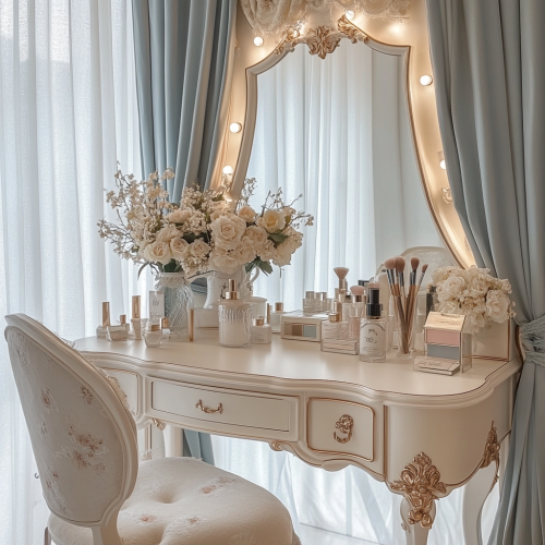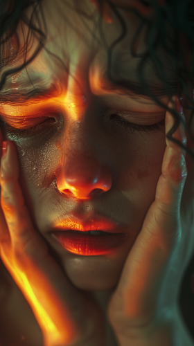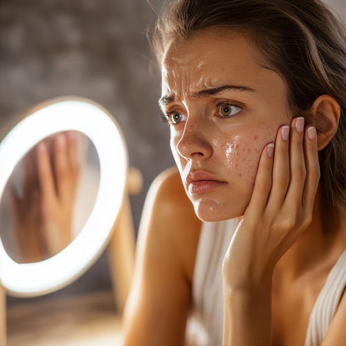 A close-up of a woman who appears unhappy due to skin issues. Her face is slightly flushed due to allergies. She sits in front of the dressing table, facing the mirror, and touches her flushed cheeks with her hand, looking depressed due to skin problems.