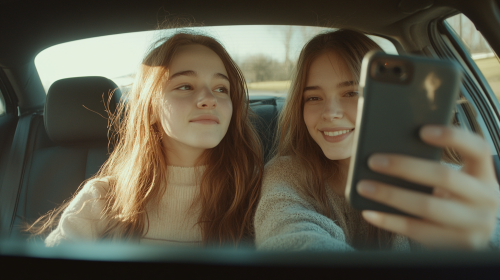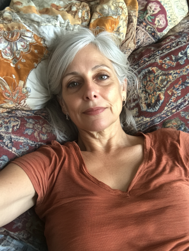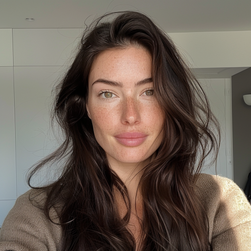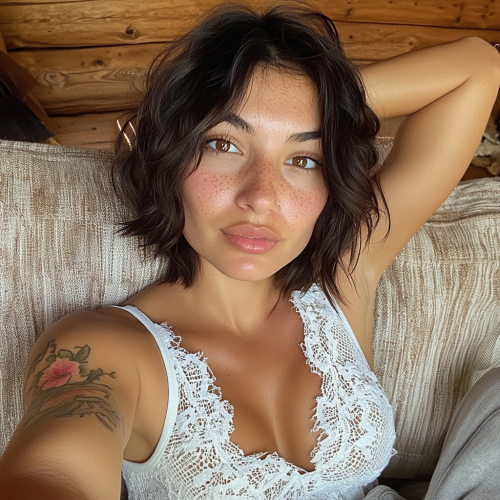 Create a picture of a brunette woman that looks like a selfie with correspondingly poor quality. The face should not be visible. --v 6.0 --style raw --s 250