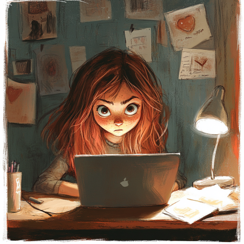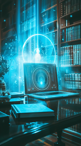 A focused young Indian female student, around 25 years old, sitting at a desk with a laptop, wearing casual attire (a plain t-shirt and jeans), with a slightly curious and confident expression as if discovering something new. His facial expression should convey excitement about learning AI for growth hacking. Short, dark hair, light stubble, and a modern, urban appearance. The background should show a blend of a tech-centric environment-- floating data visualizations or subtle digital elements, giving an impression of artificial intelligence. Keep the scene dynamic with a modern interior--like a co-working space or startup office.