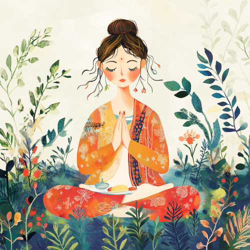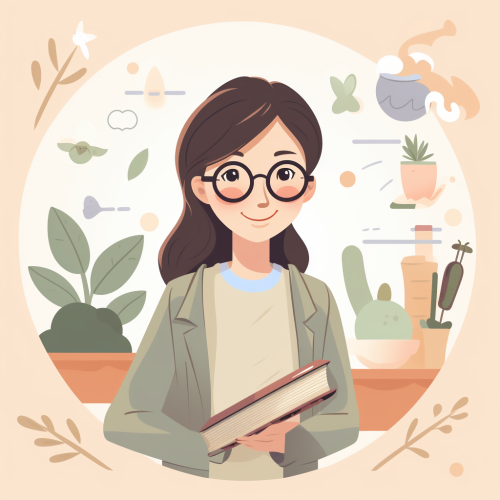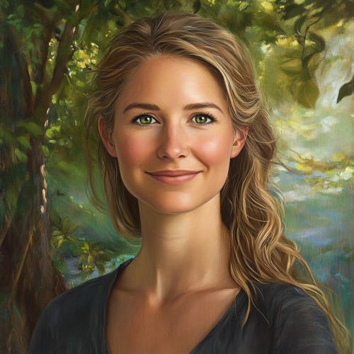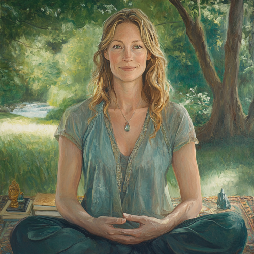 Create a detailed portrait of a tall, slender woman with light brown hair and green eyes, representing a psychologist and yoga teacher. She has a warm smile and exudes a calm, peaceful presence. The setting is an outdoor, nature-filled environment, with lush greenery and soft sunlight. She enjoys meditation and mindfulness, surrounded by tranquil elements like flowing rivers and gentle instrumental music in the background. Include elements like books on spirituality and self-help, creative artwork, and the soothing sound of nature. The overall atmosphere should be serene and reflective, with a focus on her connection to nature and inner peace.