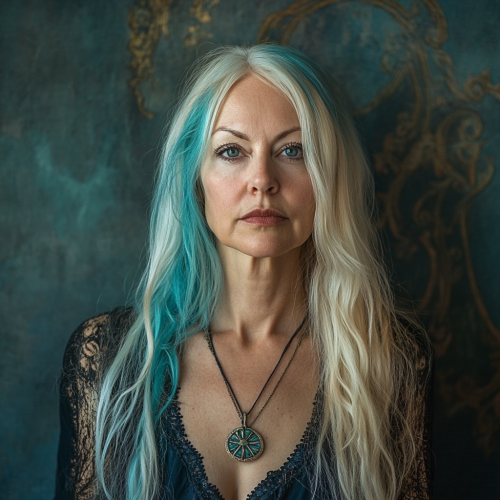 portrait of a mature woman in her 30s who is a priestess of the sea. Blonde with dyed blue streaks in her hair. Maritime amulet. No makeup. Self-confident, arrogant and moody.
