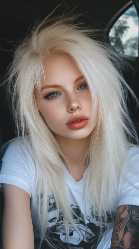 white Caucasian blonde Instagram model with big lips and surgical enhanced features, very long hair with extra volume --style raw --chaos 20 --ar 9:16