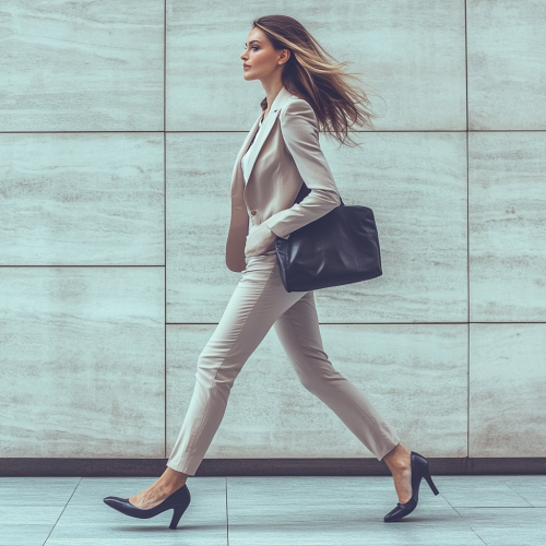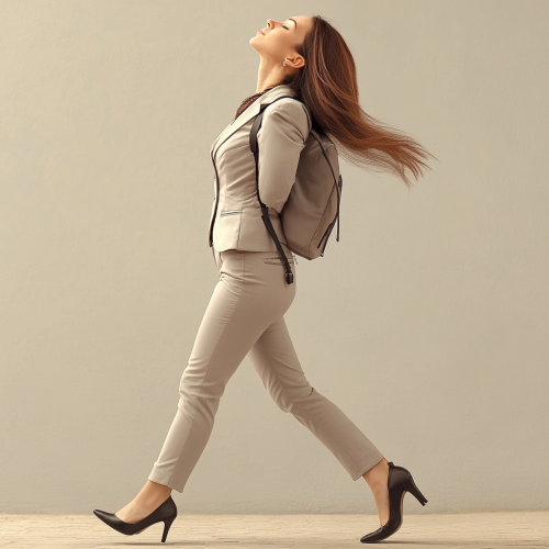 A beautiful fashionable business woman in full growth with a small gobik on her neck is rushing to work, stretching her neck and shoulders forward while walking quickly in a hurry, which leads to deformation of the spine and health problems accumulated over the years.