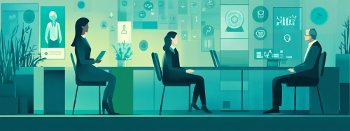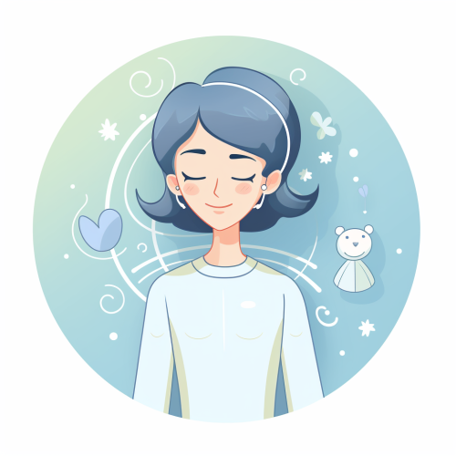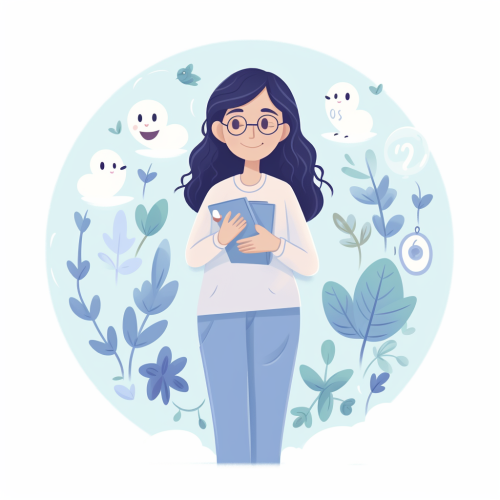 "A simple, friendly AI counselor in a 2D illustration style, with a soft, calming color palette. The character has a gentle smile, wearing a smart-casual outfit with soft blue tones, and is surrounded by subtle elements representing mental wellness (like small plants, heart symbols, or calm wave patterns). The background is minimalistic with light pastel colors, giving a welcoming and comforting vibe. The AI counselor appears approachable, with a warm expression, gently gesturing as if providing support and understanding." --v 5.2 --s 50