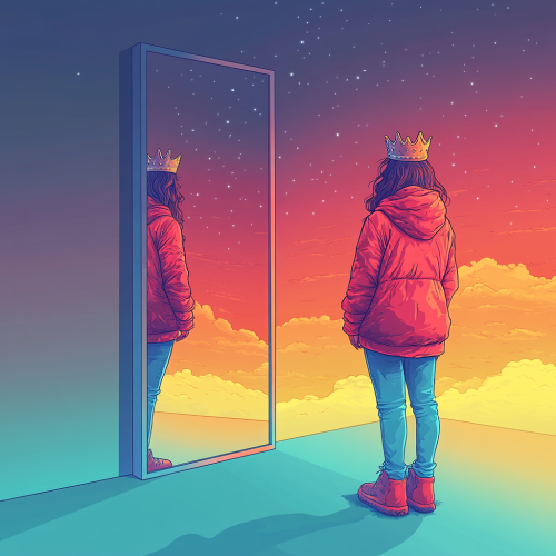 Create an illustration of a person standing in front of a mirror. In the reflection, the person is depicted with an exaggeratedly confident expression and wearing a crown, symbolizing self-importance or narcissism. The background is simple and colorful, with a gradient effect, to keep the focus on the person and their reflection. The person’s actual appearance is modest, but their reflection displays them as grander and more regal, emphasizing the theme of self-perception and ego. --s 750