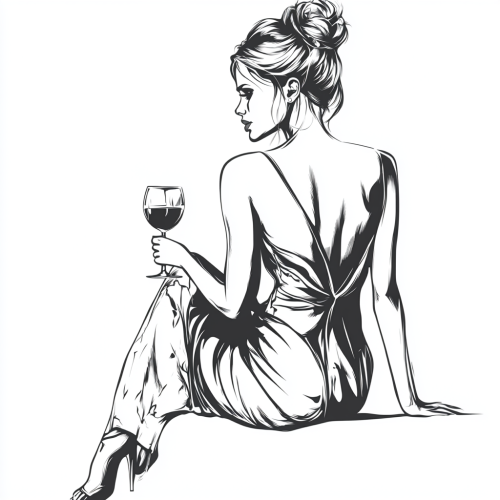 very light black-and-white illustration sketch with a vector clear background of beautiful female wearing a dress sitting, facing right, talking to herself and holding a glass of wine, minimalist, full length
