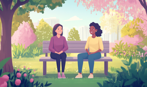A recovered woman sitting on a bench in a peaceful park, smiling. Next to her is a social worker or volunteer, assisting her with the rehabilitation process. The surroundings are calm, with trees, flowers, and a serene sky, representing hope and healing after trauma. The scene conveys warmth, peace, and a sense of new beginnings --ar 5:3