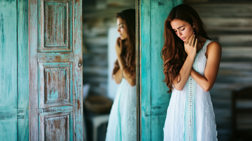 Medium shot of a woman standing in front of a full-length mirror, pinching the skin on her waist with a look of disappointment on her face, soft lighting coming from a side lamp, casting shadows on her face, the environment is a dimly lit bedroom, Sony A7R IV, 35mm lens, cinematic lighting with cold undertones, her reflection visible in the mirror --ar 16:9 --chaos 50 --style raw