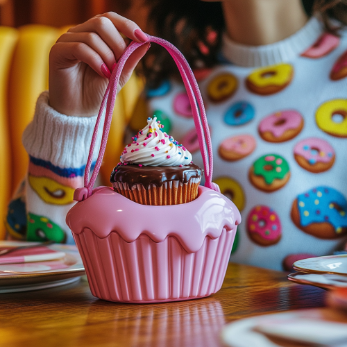 a woman pulls a chocolate cupcake out of a pink purse that is shaped like a large cupcake with a pink strap, the woman is wearing a sweater with a colorful donuts with sprinkles pattern and sitting at a dinner table