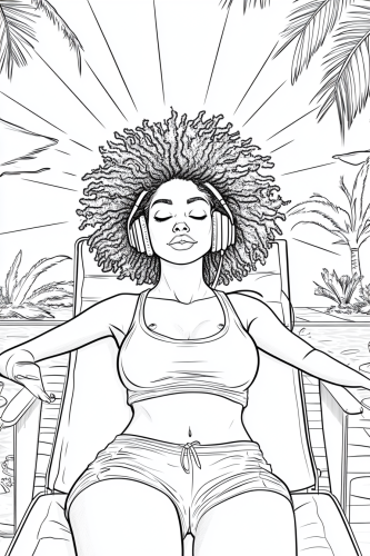 A coloring book page of a woman laying in a field of daisy flowers. The background is simple to keep the focus on her figure, with subtle lines or patterns around her for coloring. This design captures self-care through relaxation techniques. Black line art, no shading, white background --no shading