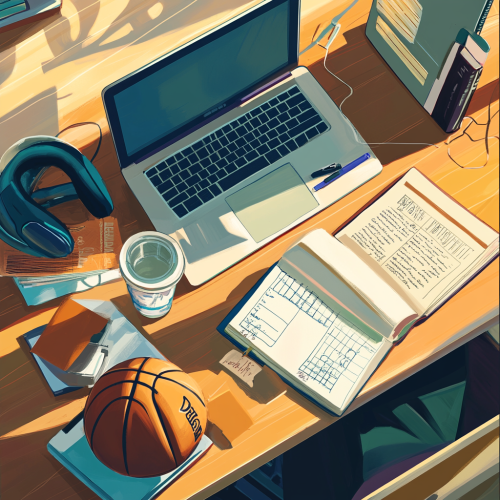 Create an image featuring a high school-aged student-athlete juggling basketball practice, schoolwork, and relaxation time, capturing the balance of being both a student and an athlete. The scene should show a tidy desk with open textbooks and a laptop, a basketball nearby, and a planner with a weekly schedule visible. Add subtle elements that represent relaxation, like headphones or a water bottle with a motivational sticker, to emphasize self-care. The setting should feel inspiring and organized, with natural lighting and a calm, focused atmosphere that reflects both discipline and balance. Use a warm color palette with blues and natural tones, making it relatable and inviting for young athletes. Aim for a realistic, detailed style that resonates with the challenges and organization of balancing school, sports, and life.