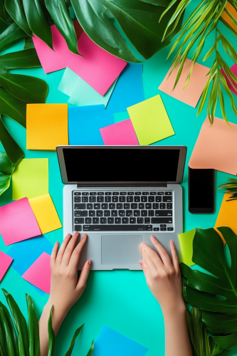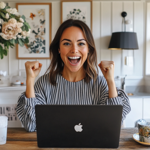 heart centred female entrepreneur in a minimalist, inspiring hn workspace, looking excited while working on her laptop, with a clear, open background that feels welcoming and inviting, symbolising personal growth and achievement in digital marketing
