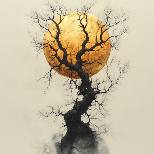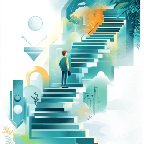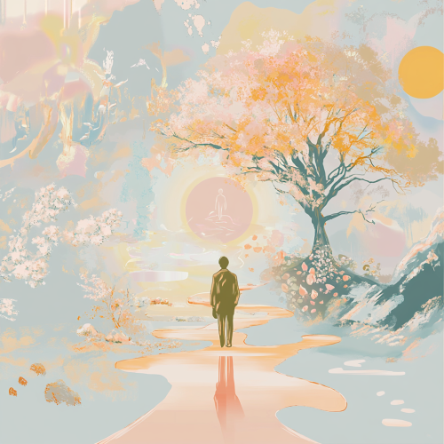 Generate a digital art for A digital art scene depicting a person standing at the intersection of personal and professional growth paths. The background is a blend of soft pastel colors with the primary color being light gray. The person is surrounded by symbols of success and fulfillment, such as a blooming tree and a rising sun, representing a more fulfilling and successful life. --ar 1:1