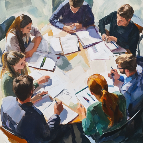 Create a vibrant, dynamic study group scene, with professional personal coaching in progress, focused and determined white caucasian students surrounded by advanced tech and supportive expert tutors, embodying a sense of achievement and personalized support. --fast