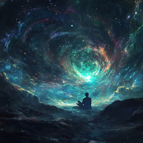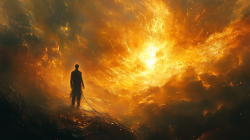 Create a visual representation of the ego and soul. The ego should be depicted as a dark, fragmented figure, standing tall with a posture of pride and arrogance. Surround the ego with chains, material objects, and other symbols of attachment, showing its desire for control and separation. In contrast, the soul should be a radiant, ethereal figure bathed in soft, healing light. The soul's posture is open, peaceful, and connected to the universe, emitting a calm, harmonious aura. Place both figures facing each other. The space between them should symbolize the clash between light and shadow, or division and unity. The background for the ego is chaotic and rigid, while the soul stands in a serene, flowing, natural landscape, representing harmony and connection. --ar 16:9 --s 750