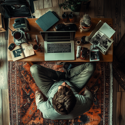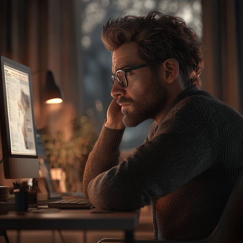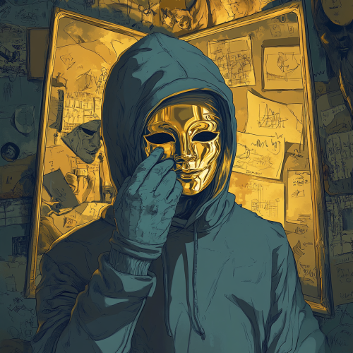 A surreal image of a founder in a hoodie holding a shining, glamorous mask in front of their face while their reflection in a mirror reveals a different, thoughtful expression. Behind them, the surroundings are cluttered with elements of deep work, like sketches, blueprints, and notes, symbolizing that the true work happens behind the ‘mask’ of the celebrity persona. Screen print art style.