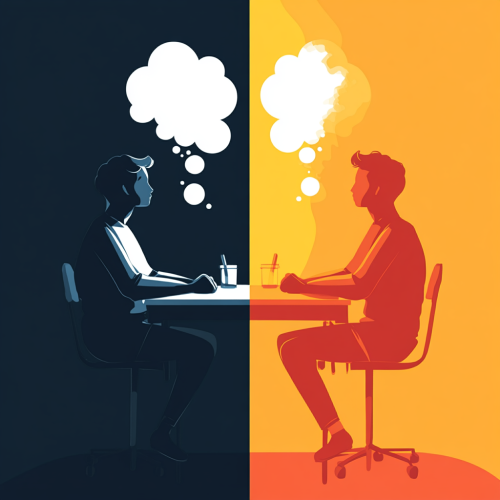 a split image, split in the center, person sitting at a desk, deep in thought. Each side has a thought bubble. On the left side he is thinking small, meaning he has small goals. On the right side he is thinking really big and has big goals.