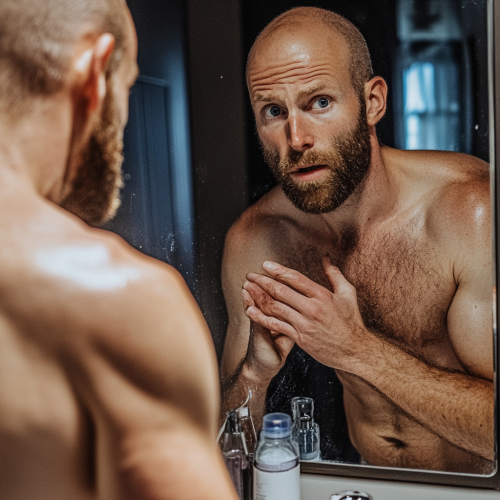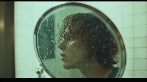 16mm analogue still, A person stares back at their reflection in the mirror. They’re covered in sweat and slightly out of breath with long, shaggy hair. They’re a little bit out of shape. They look down the barrel of the camera, and as they speak. --ar 16:9