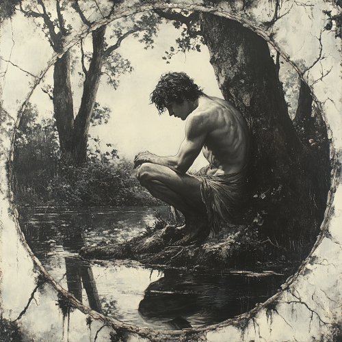 According to the myth, Narcissus, tired from chasing game, stopped at a stream one day to quench his thirst. In the smooth surface of the water he saw his reflection, which struck him with its extraordinary beauty. Narcissus fell in love with his mirror image. --s 750