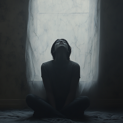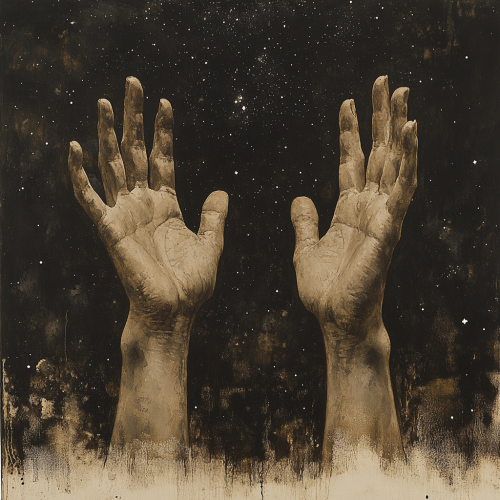 A pair of hands reaching upwards towards the sky, fingers extended as if in a gesture of surrender and seeking guidance, depicted in intricate detail. The hands appear slightly weathered, symbolizing strength and vulnerability, with subtle highlights catching on each knuckle and finger, giving a sense of realism. The background is dim, with faint traces of starlight barely illuminating the space, enhancing the sense of solitude and depth. The overall atmosphere should be calming yet powerful, emphasizing a profound moment of reflection and openness, as if the person is reaching toward something greater ar 16:9 --v 6.1 --s 750